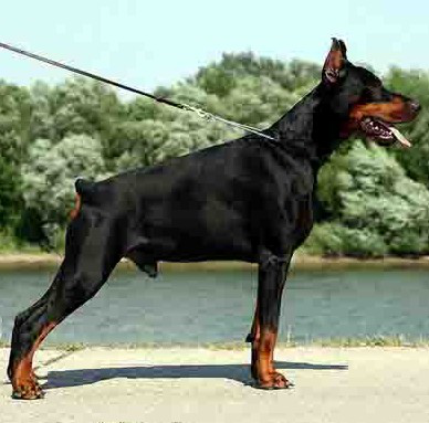 拳师犬,原产地德国,体形外貌漂亮强健。头和身体很相称,鼻大而黑。耳生长位置较高,常人工切去耳尖。眼黑色。颈圆柱形很强壮,富有肌肉,无下垂皮肤。躯体呈正方形,尾巴人工切除(欧洲等国,人性化开始留尾,留耳),尾短,始终高举。前肢直立、平行。忠诚,不记仇。尤其对儿童富有感情,易训练,可用作警犬、护卫犬、个人警卫犬,也可用于导盲犬。由于其服从性好,也是一个很好的伴侣犬。