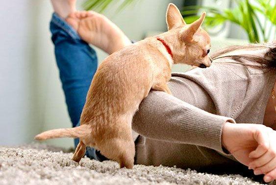 发情期的狗狗,都会有骑跨行为。很多时候,要是家里没有可以交配的同类,狗狗就会对着主人做出尴尬的行为,抱着主人的大腿发泄。