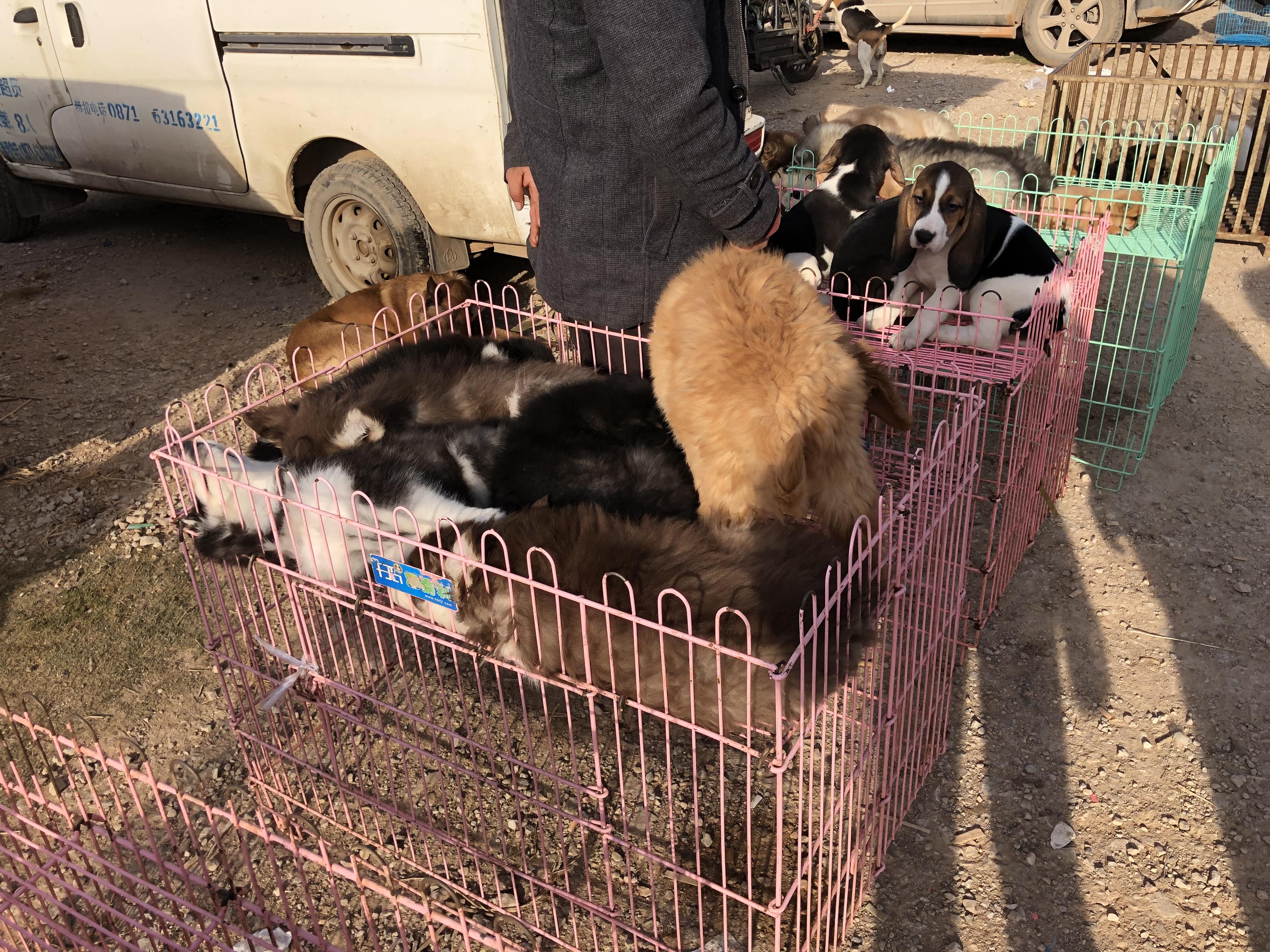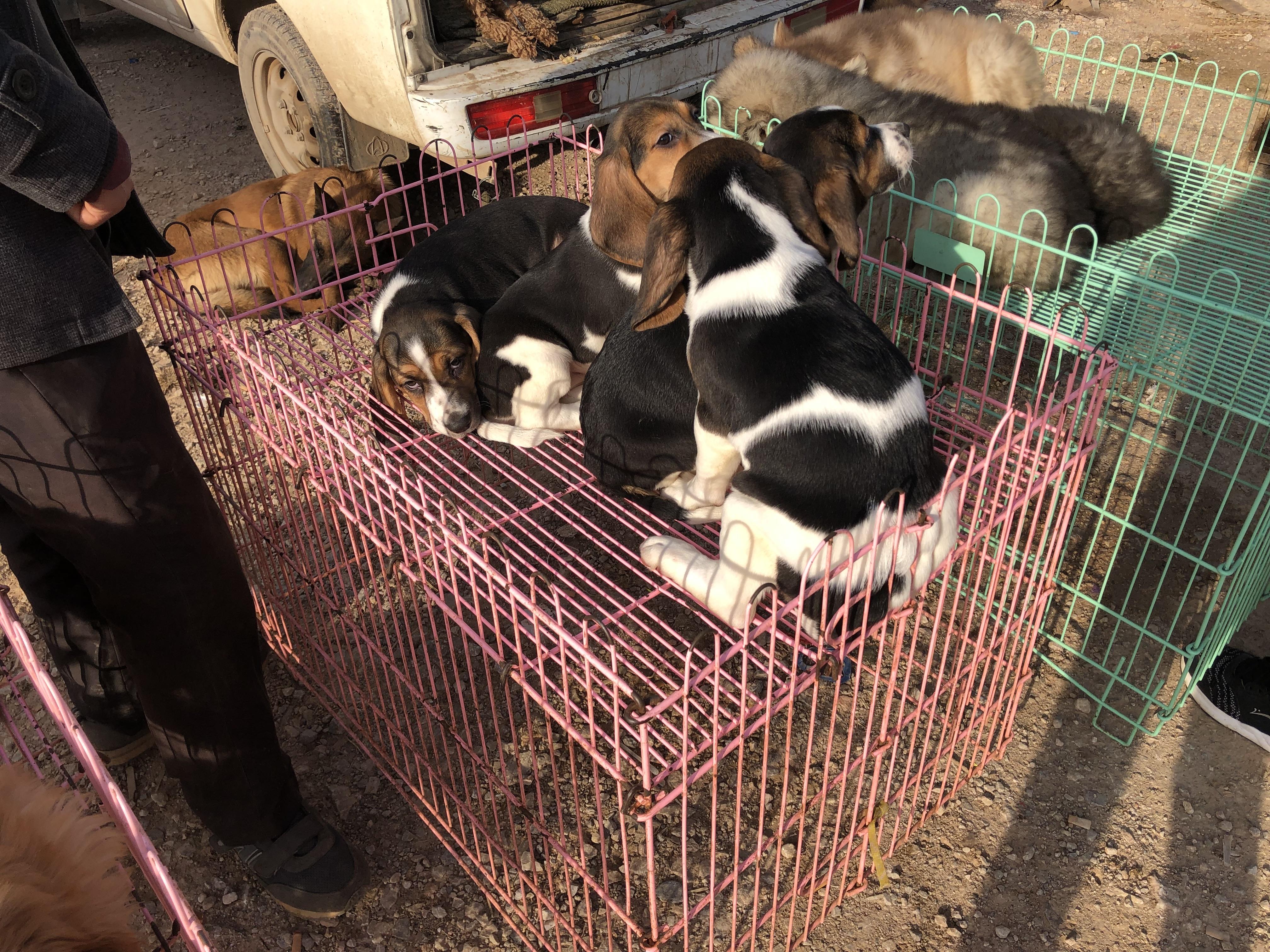 图片中的宠物狗是名为比格猎犬的宠物狗,这种宠物狗在狗市里面,我们是经常不常见的,我们这里说的是在我们这里的狗市并不是说在所有狗市里。这是一个商贩在狗市里支起了一个摊位,我们可以看到在这个粉红色笼子上面全部出售的都是比格猎犬,据了解这是同一窝幼犬,一个女子正在挑选比格猎犬。