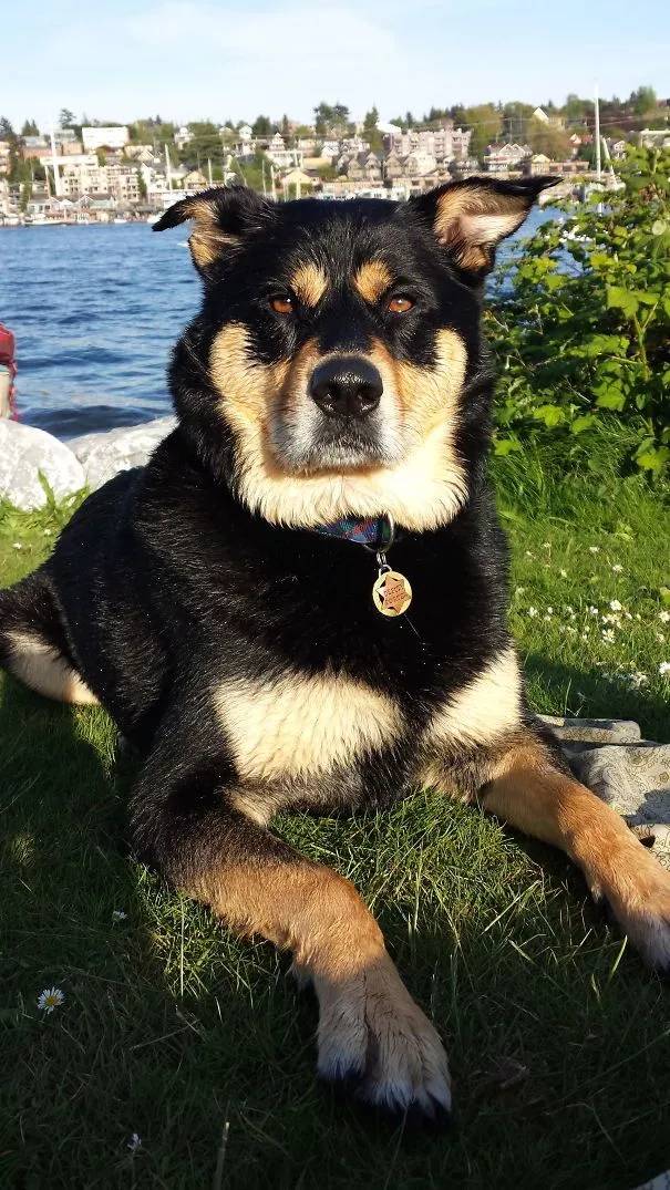 哈士奇+罗威纳,一张脸上能看到两种狗子的影子。