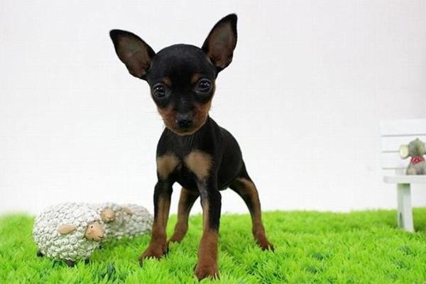 8、迷你杜宾犬:迷你杜宾犬起源于德国,身高一般在25-31cm,体重在3-4kg,毛发短平,紧贴身体,体型娇小,身材结实,行走时昂首挺胸,喜欢自由玩耍,毛发梳理也比较简单。
