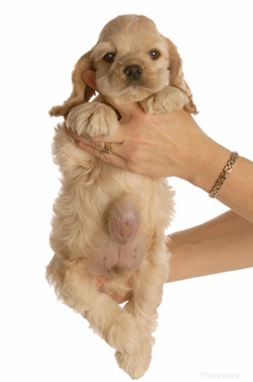 症状:脐部出现大小不等的圆形隆起,触摸柔软。无痛、无热,压迫可感觉到疝孔,挤压疝囊或动物背卧位时疝内容物可还纳,挣扎或食后时隆起增大,此种为可复性脐疝。少数病例疝内容物发生粘连或嵌闭,触诊囊壁紧张,压迫或改变体位不能还纳疝内容物。若嵌闭的疝内容物是肠管,则表现急腹症症状。腹痛不安,饮食废绝,呕吐,发热,严重者可出现休克。