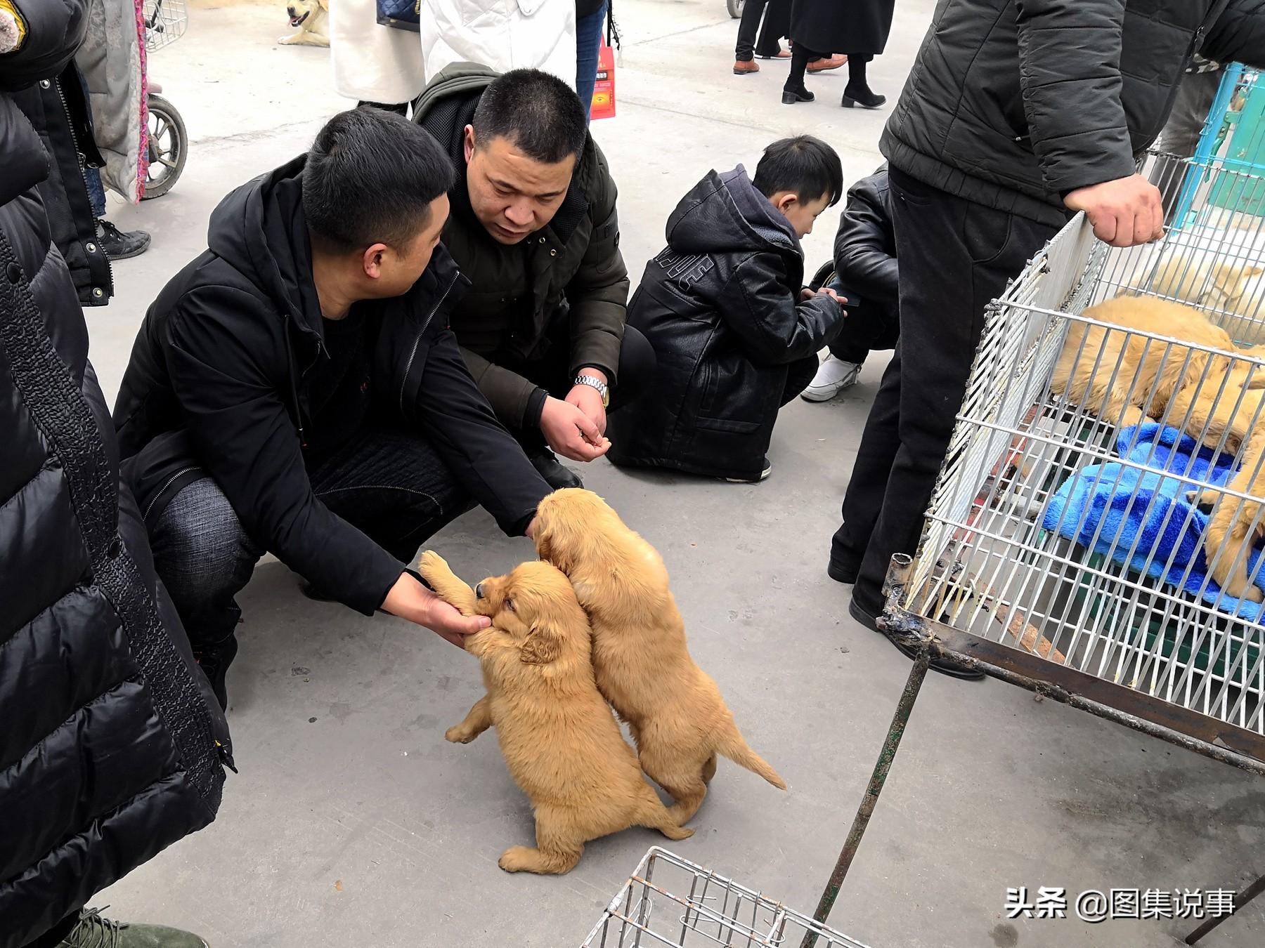 两位朋友在帮忙挑选,一只卖300元。朋友小哥说,金毛犬性格温顺,对陌生人友好,不像藏獒,金毛犬几乎不会主动攻击并伤人。不过,你要对它的饭量有个心理准备,想养好它,也不要心疼狗粮钱。