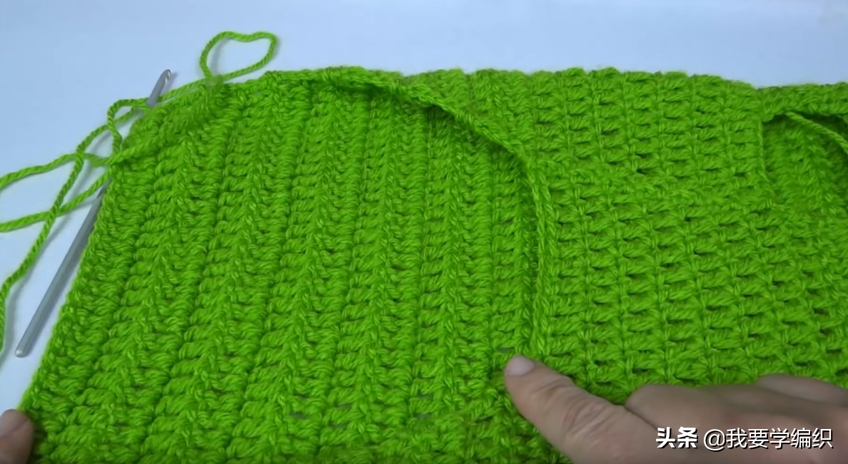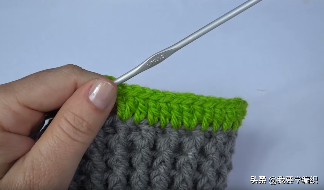 然后2锁,直接挑侧边,每1行里钩2针短针,就这样顺着挑一整圈(横边处每1针里钩1针短针)。再下1圈,换A线钩一圈中长针。