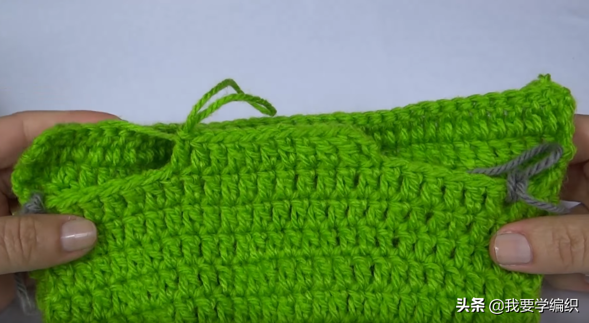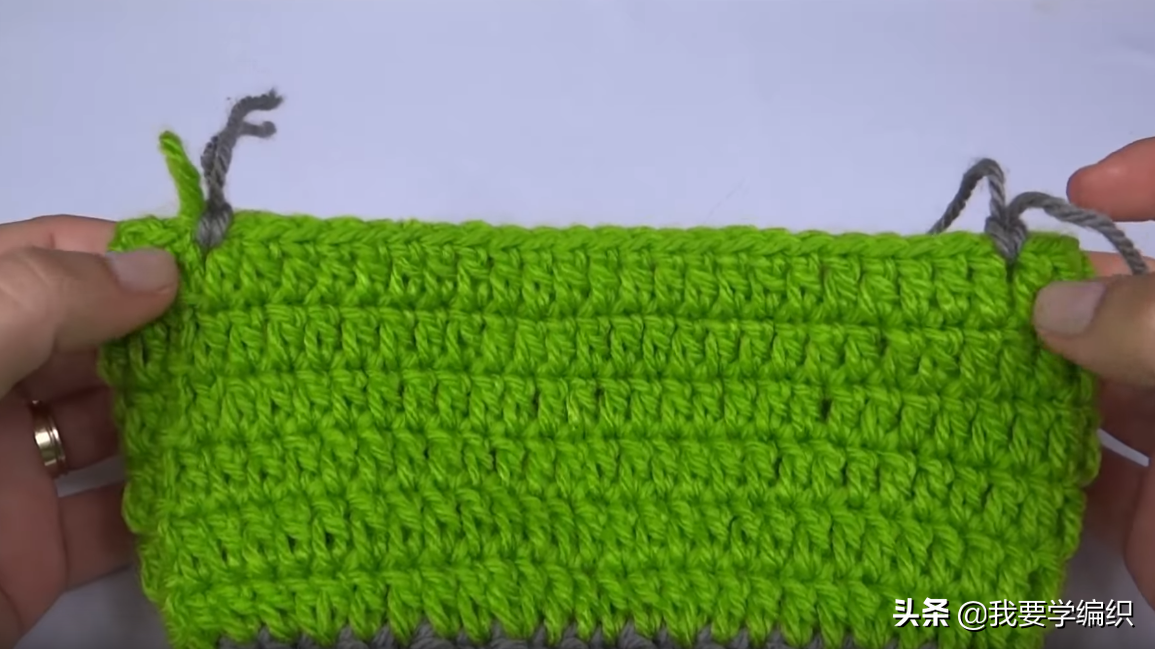 接着我们要减针了,我们头尾各减1针(长针2并1),留11针不钩,然后再翻面,仍然是头尾各减1针,其它地方不加不减钩;重复这样的规律,每圈头尾各减1针,我们一共钩了12圈。