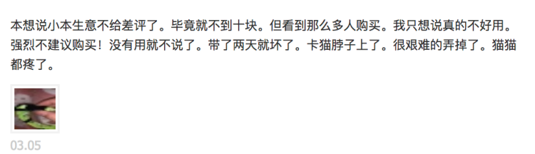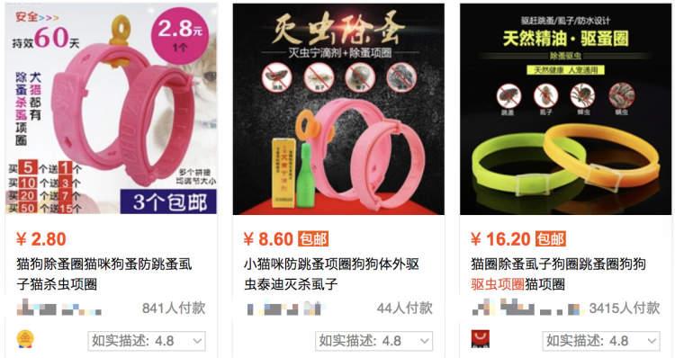 周到君在电商平台上看到,如今市场上销售的驱虫项圈,价格多在10元以内至数十元。部分用户评价气味大,宠物易被卡住等。