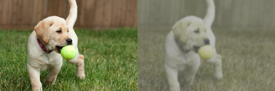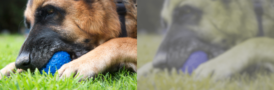 一只拿着黄色网球的狗的人类视图(左)和狗视图(右)。狗能够区分黄色和蓝色与绿色,这可以解释为什么它们更喜欢黄色网球而不是不同颜色的玩具。