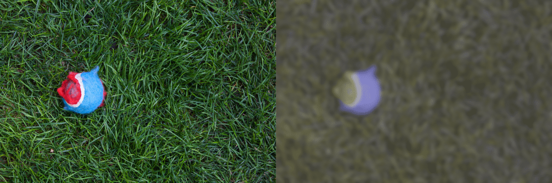 带有蓝色球的狗的人类视图(左)和狗视图(右)。狗能够区分黄色和蓝色与绿色,这可以解释为什么他们更喜欢蓝色和黄色的玩具而不是不同颜色的玩具。