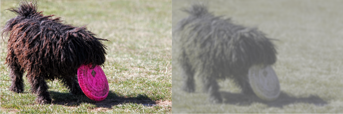 左图:一只狗嘴里含着橙色、红色和黄色的圆珠的人类视角。右图:通过狗视觉图像处理工具解释犬眼中的相同场景。