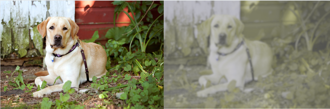 左图:拉布拉多猎犬坐在被植物包围的红色谷仓前的人像。右图:通过狗视觉图像处理工具解释犬眼中的相同场景。
