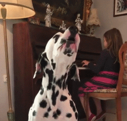 小主人在家里练习弹钢琴,斑点狗还在旁边扯着脖子跟着音乐一起嚎,像是在给小主人伴唱,有这么一位活宝,练起钢琴来应该也会很有动力吧。