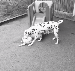 斑点狗从小到大都是很活泼的,它们跟自己的孩子们玩耍时就是这样的场景,一大群狗子在一起追逐翻滚,玩的超级开心。斑点狗妈妈也会通过这种游戏来教给小狗一些必备技能。