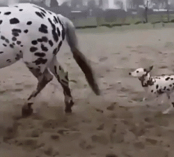 斑点狗:你为什么跟我长得这么像?你是我妈妈对不对?妈妈你别跑,等等我呀!马:我真不是你妈…