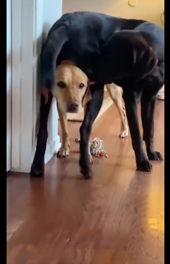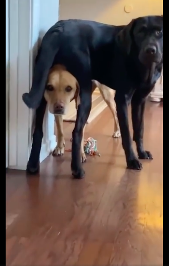 就有这么一位网友,家里养了两只狗狗,一只是黄狗一只是黑狗。因为黑狗的个头比黄狗大,所以经常能看见它欺负黄狗。就比如这一天,网友正在家里休息呢,然后就看见黑狗故意将腿抬起来,然后骑到了黄狗的头上,就这样坐了下来!而黄狗明显是被欺负怕了,就站在原地不敢动,可怜巴巴地看着主人!