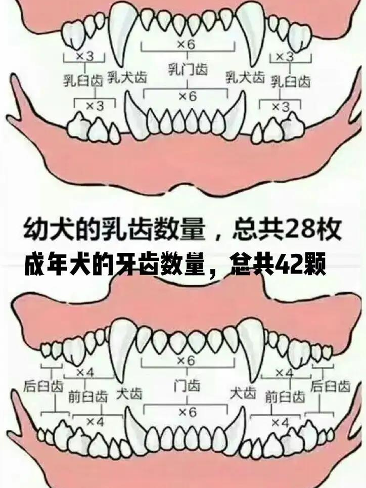 门齿上下各6枚,犬齿上下各2枚,前臼齿上下各8枚,臼齿上颌为4枚,下颌为6枚,总共为42枚。