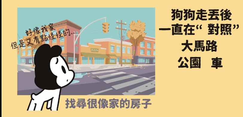 狗狗走丢后在找架的过程中,他其实一直在做的事情叫做对照。他就会一直早晨,看起来跟家很类似的房子,很像家,前面的大马路,很像常去的公园,很像家人的车。在这种惊慌失措的情况下。平常的方向感其实没有什么用了。反正是类似家附近的画面会让他想停下来看看。闻闻狗狗会每分每秒的在找家的路途上一直做这样的对照,所以有些狗狗被找到的时候其实已经离家很远了。可是他却停留在很像家的地方。