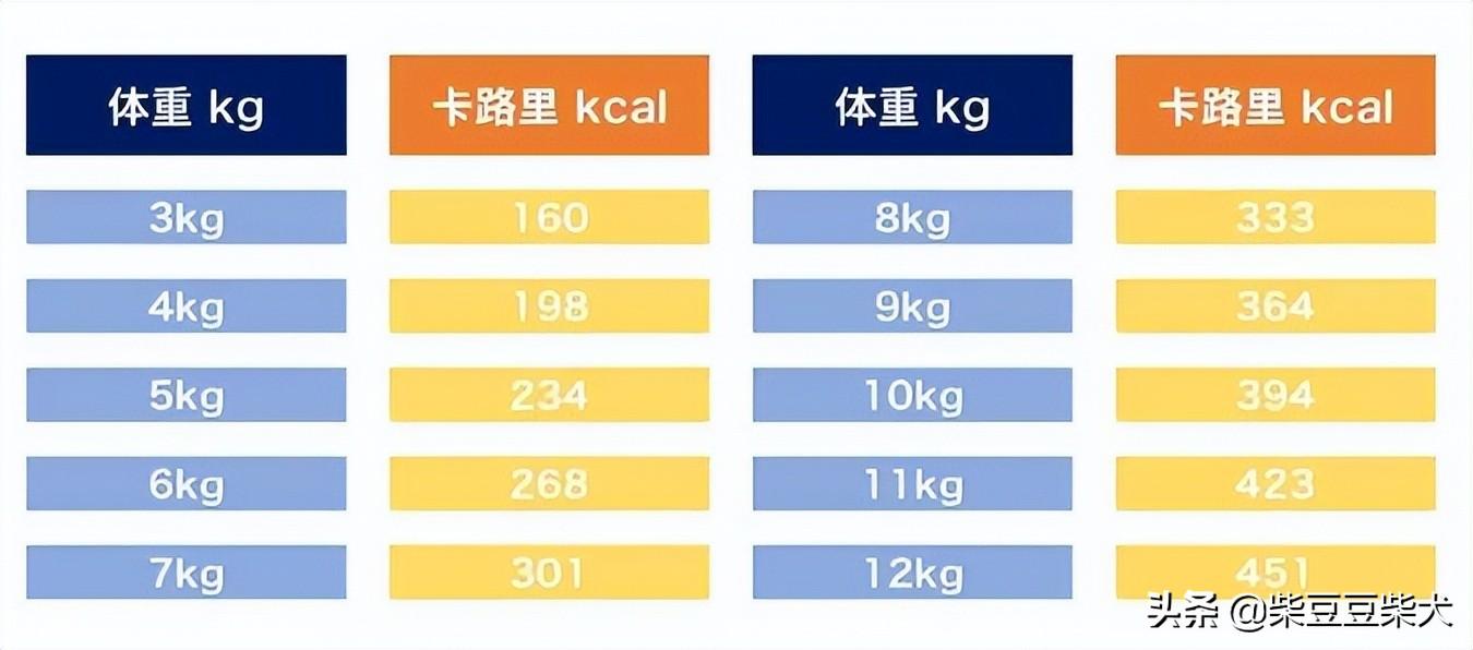 不会算的家长,可以按照狗狗的体重参照下表得出RER基数