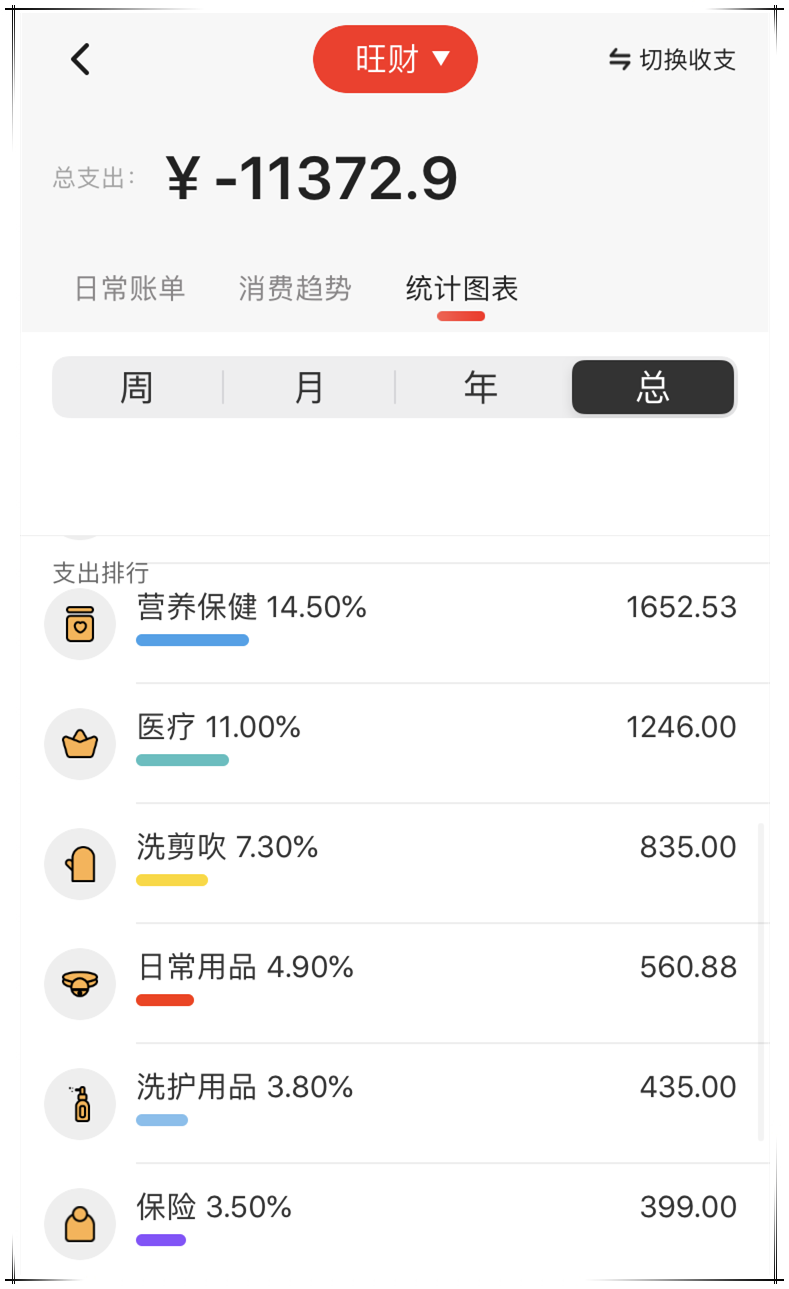 再来看看有记账习惯的课代表@咚咚锵家的旺财,从2021年1月至今产生的账单,供大家参考: