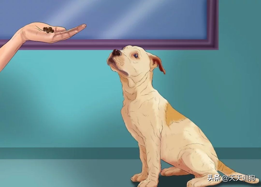 2. 站在狗狗的正前方,让它的注意力集中在你的身上。再给狗狗展示你手里为它准备的食物。