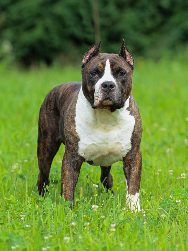 美国斯塔福梗(American Staffordshire Terrier)斯塔福梗是由斗牛犬和梗杂交而来的,最初叫做斗牛犬、牛梗杂交犬,有时被称为斗犬或斗牛梗。后来,在英格兰被命名为斯塔福斗牛梗。 美国斯塔福梗的标准中体重的范围较大,但应该与体形成比例。这种犬以其体形,结实匀称,头部强壮有力,躯体肌肉发达以及勇敢坚强而闻名。 美国斯塔福硬给人的总体印象是:体形有力,紧凑,肌肉发达,而且活泼、热情,喜欢生活的环境。外形粗壮,但腿不宜太长,与外形不和谐。很有勇气。