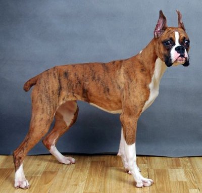 拳师犬,原产地德国,体形外貌漂亮强健。头和身体很相称,鼻大而黑。耳生长位置较高,常人工切去耳尖。眼黑色。颈圆柱形很强壮,富有肌肉,无下垂皮肤。躯体呈正方形,尾巴人工切除(欧洲等国,人性化开始留尾,留耳),尾短,始终高举。前肢直立、平行。忠诚,不记仇。尤其对儿童富有感情,易训练,可用作警犬、护卫犬、个人警卫犬,也可用于导盲犬。由于其服从性好,也是一个很好的伴侣犬。