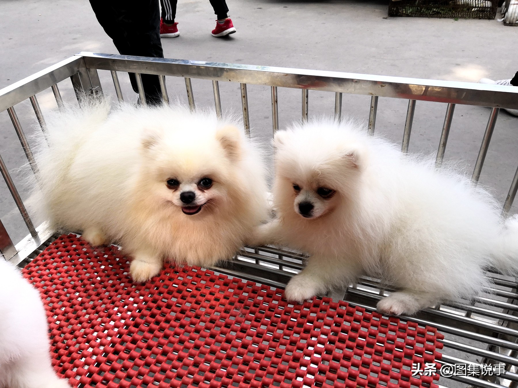 摊主说,这是美版博美,白色长毛。右边的博美4个月大,要价800元。左边的博美四岁了,卖价1500元。