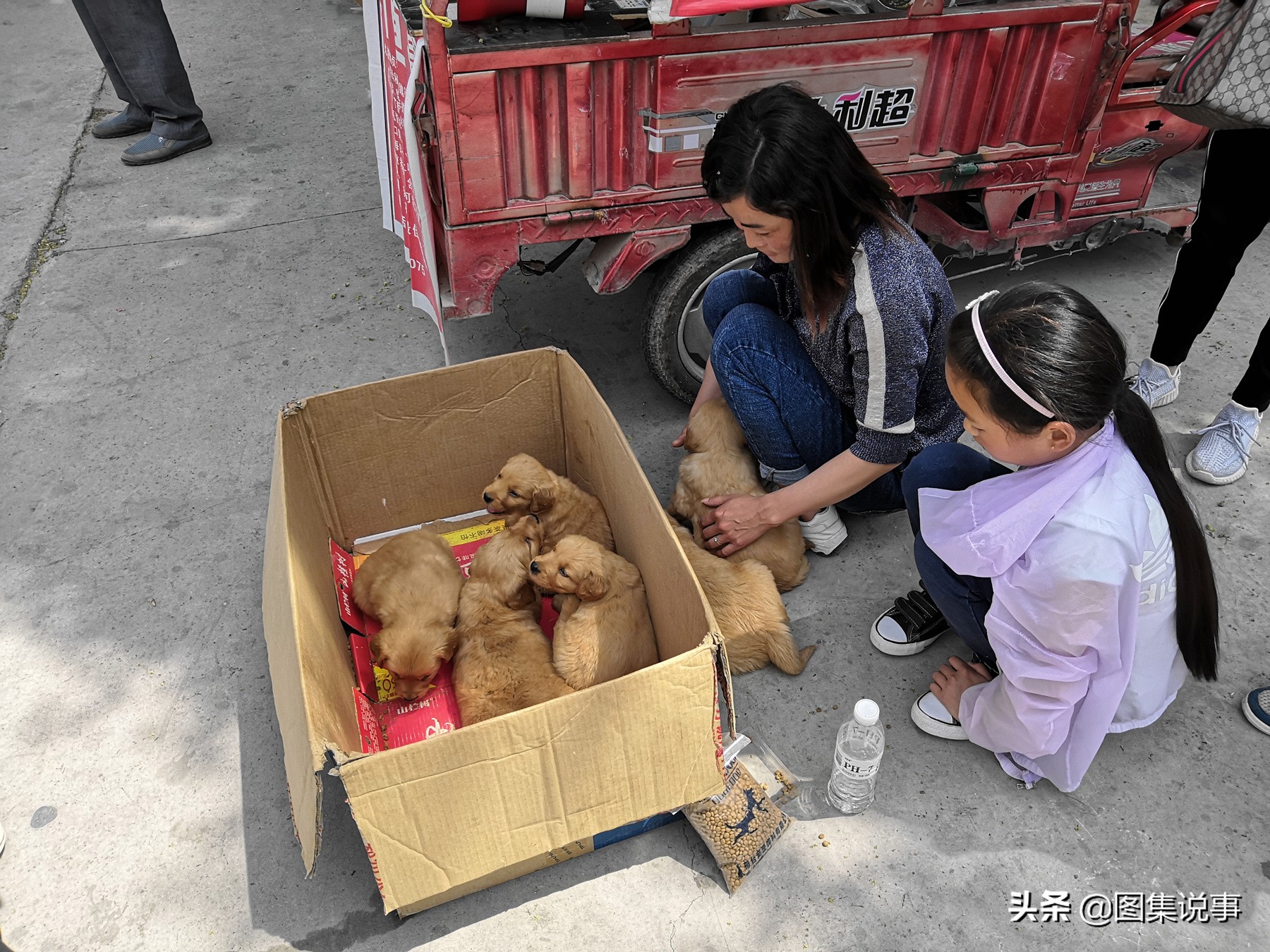 这位大妹子家里养的一条大金毛,下了八九个狗娃。大妹子说,活了八只,已经有40多天了。喂过驱虫药了,还没有打疫苗,每只金毛400元。