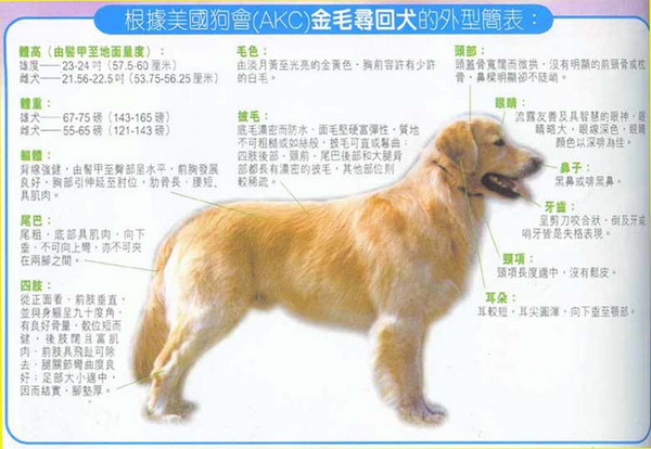 金毛的颜色从奶油色到深黄色都是允许,英系多为浅色(纯白不接受).美系多为深色.