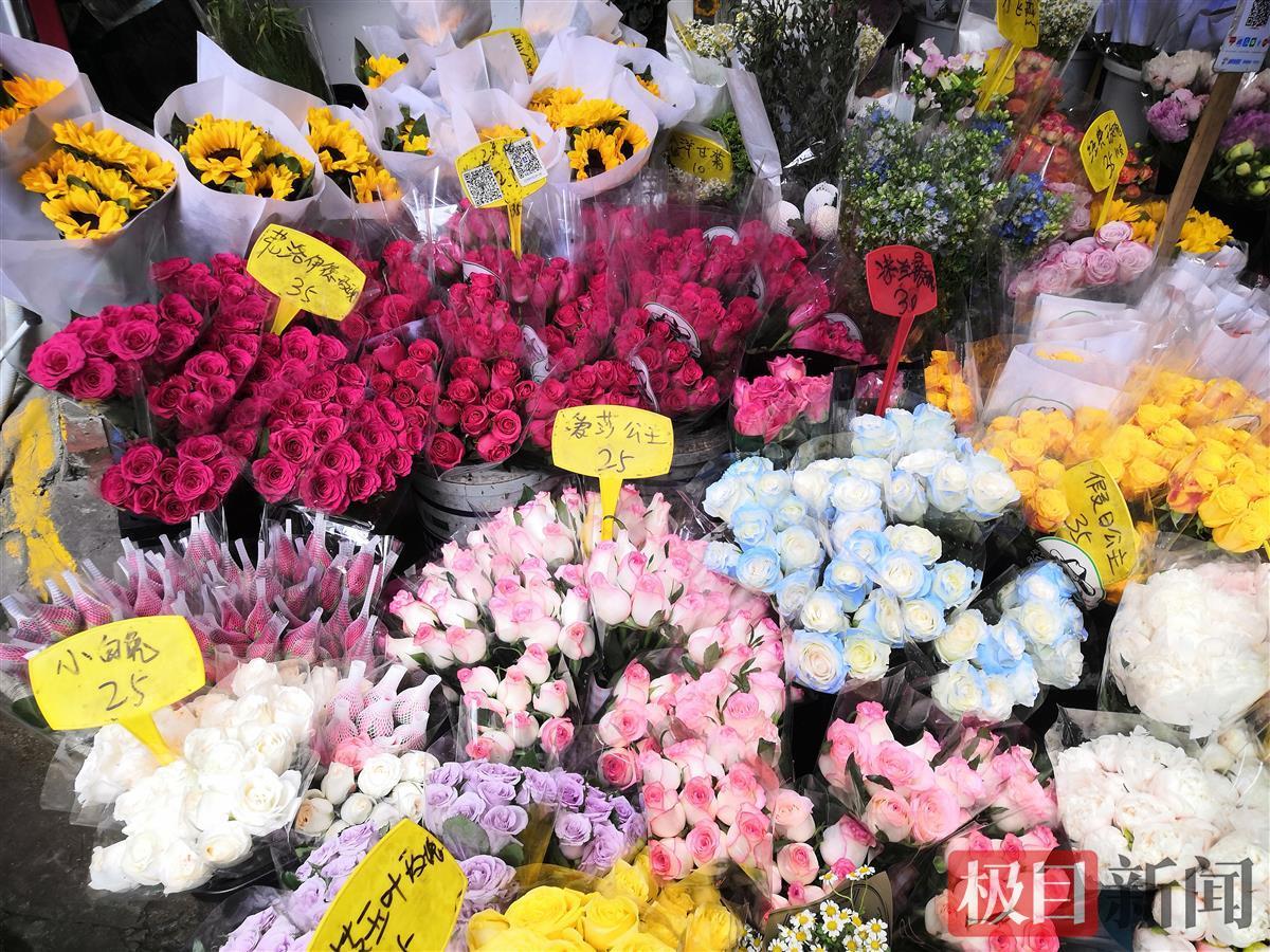 在走访过程中,极目新闻记者了解到,花市内最热销的当属玫瑰、芍药和百合。以玫瑰花为例,有的玫瑰花花苞娇小可爱,有的花头较大、娇艳美丽,这些玫瑰花的售价也各不相同,有的卖10元一支,有的卖5元一支,还有的卖20元十支。上述花店老板解释道,那是因为玫瑰的品种不同,有的是进口玫瑰,有的是国产玫瑰。