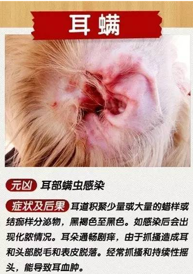 耳螨是耳部感染螨虫所致。症状是狗狗会经常没有原因的摇晃脑袋,狗狗用爪子不断的抓挠耳朵,狗狗有泪痕和狗狗耳朵有异味。主人平时一定要定期帮狗狗清洁耳朵,避免狗狗长耳螨。