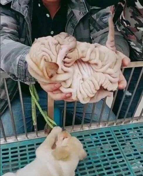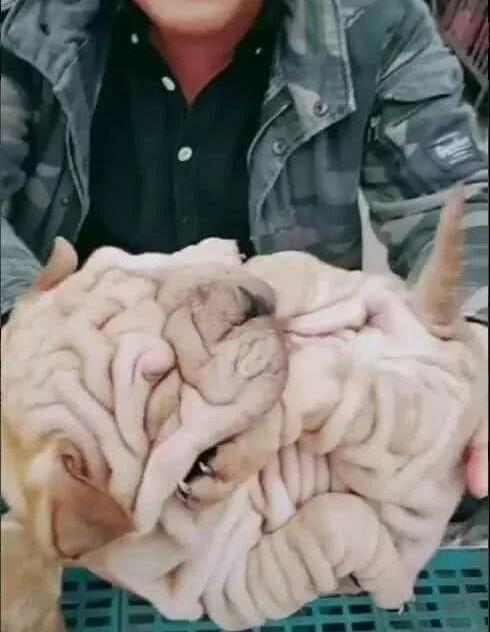 来看看两万块钱的狗狗长啥样?对,没错,就是捧在手里的那一坨,乍一看不知道是什么东西的狗狗。很多吃瓜群众都惊呆了,就这么一坨丑丑的狗居然要两万块钱!不过,男子自己却说亏不了,因为这只狗狗就是他苦苦寻觅好久的沙皮犬。