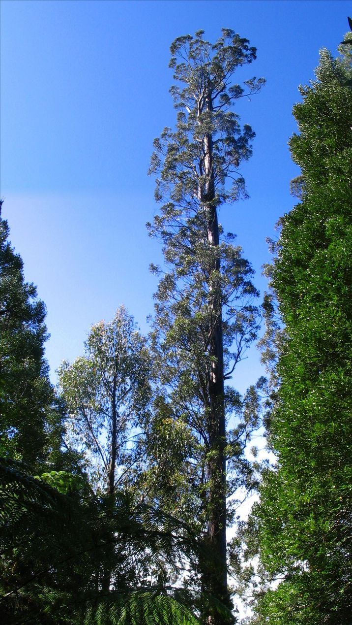 生长在澳大利亚的杏仁桉首当其冲,如果你去搜索一下“最高的树”,结果肯定是杏仁桉(Eucalyptus regnans)。杏仁桉分布于澳大利亚大陆和塔斯马尼亚岛,属于被子植物门之下的桃金娘科,其高度超过100米,甚至还有150米和170米的传闻。