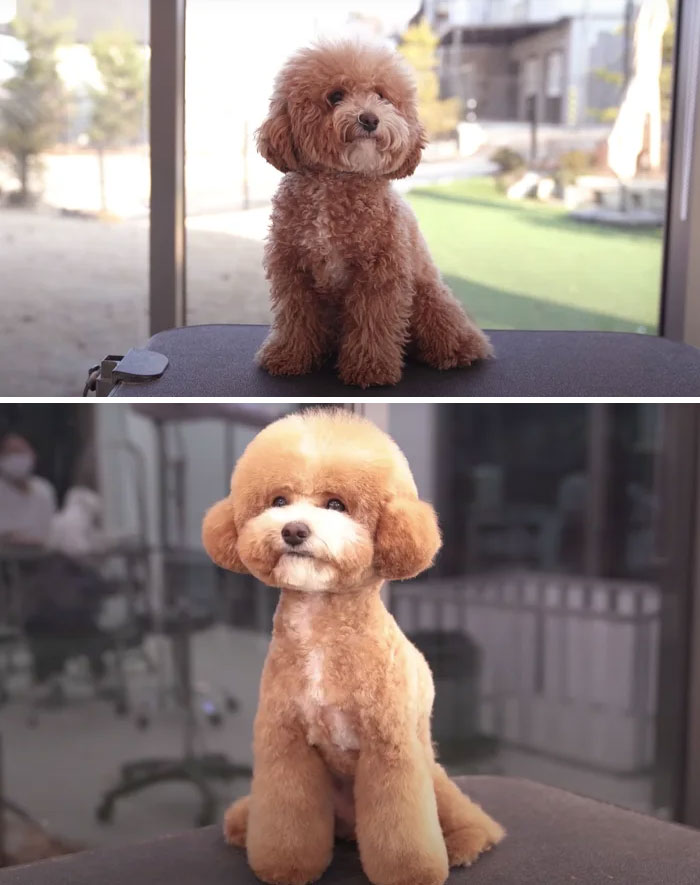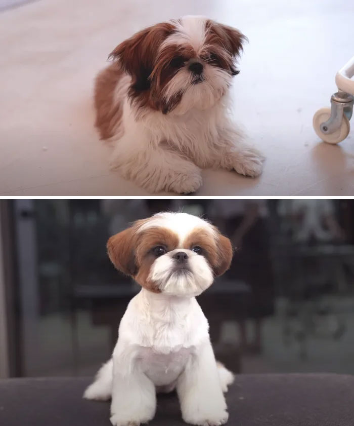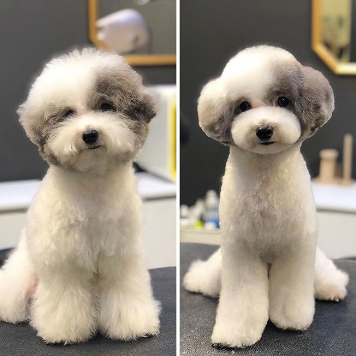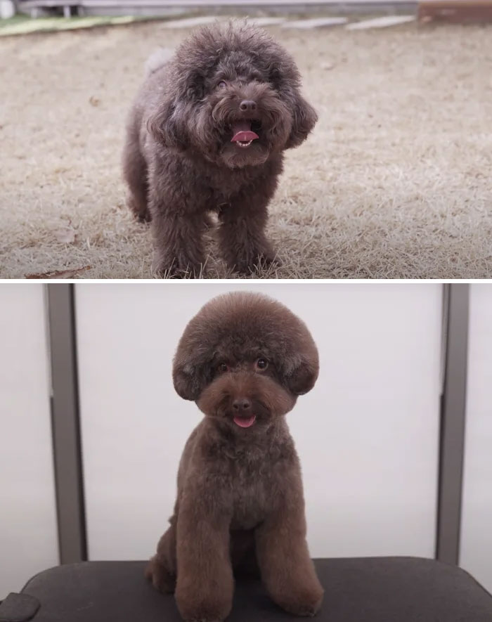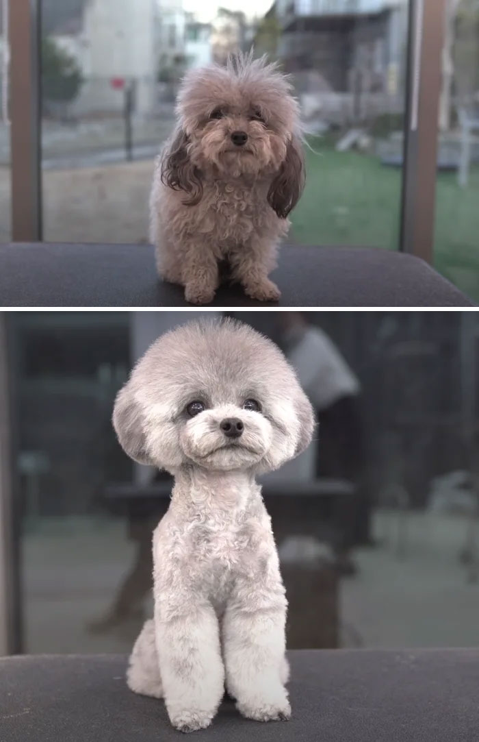 这组照片是韩国的狗美容师Shu和Tree的给狗狗美容改头换面的结果,美容后的狗狗看起来更加的精神,漂亮。图为剪短狗毛的狗狗,是不是像刚剪了一个头的样子变帅了一大截子。