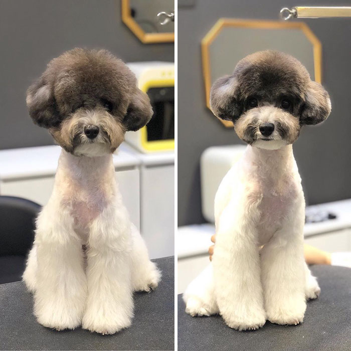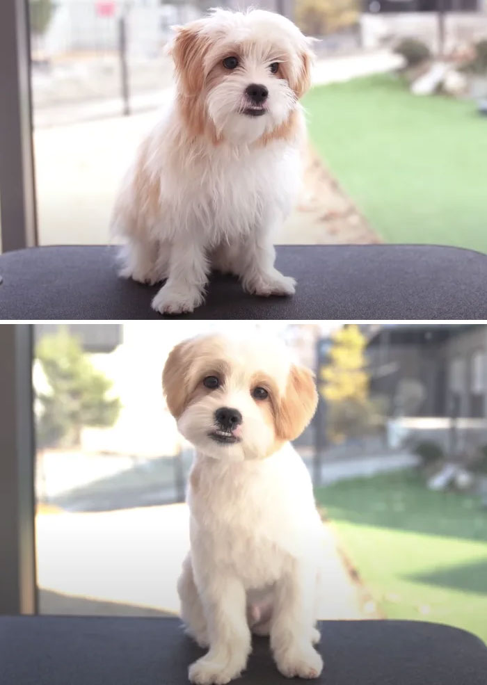 图为美容前后的狗狗对比照,有没有感觉从村姑变成都市女孩的样子。