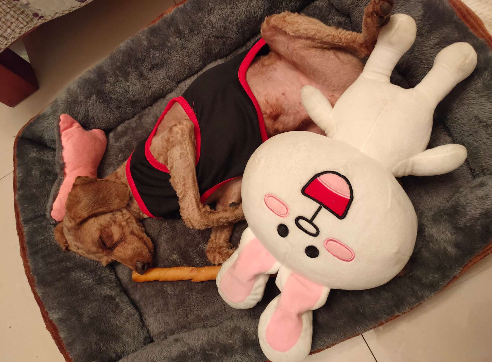 后续铲屎官给狗狗买了狗窝,和毛绒玩具,并不断安慰狗狗,狗狗才慢慢放下了警惕,开始躺下睡觉。