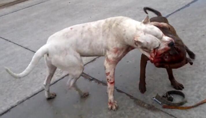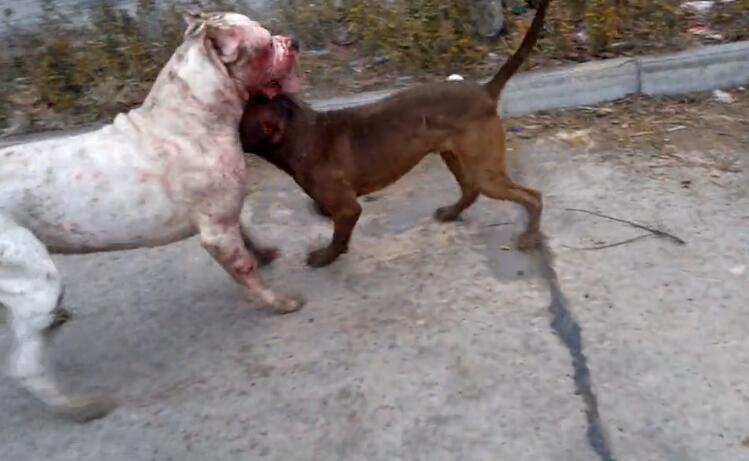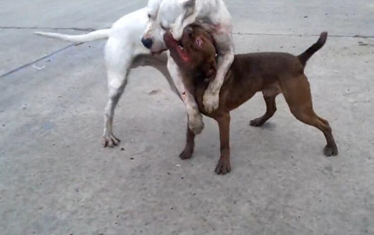 但比特就是为了打斗而生的,它咬住杜高的脸,然后不断地推,终于,“牛高马大”的杜高被小矮个比特给推倒了,然后被比特不断啃咬,在这个过程中,杜高也不断反击,反咬比特的脸