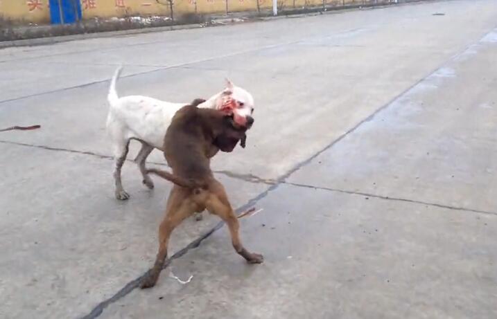 两条狗狗扭打在一起,这个时候都挂了彩。地面上的血迹星星点点,看了有点渗人