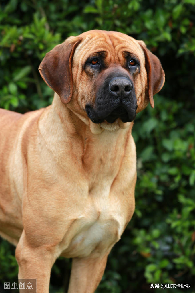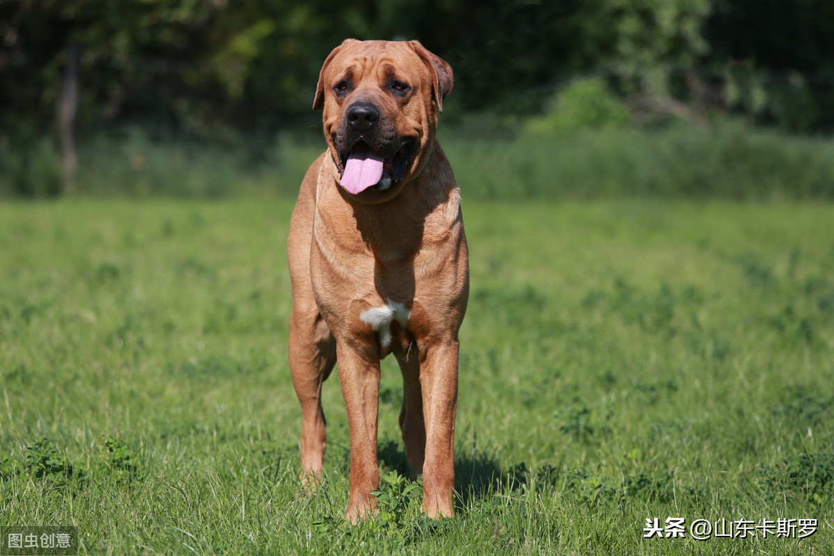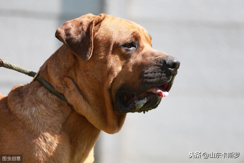外观性情:身体粗壮,肌肉发达,精力充沛。骨架结实,体格健壮有力。头大,头顶平坦。吻端成方型。嘴宽阔,颚部肌肉发达,十分有力。牙齿尖利。耳根位置靠后,耳朵悬垂。颈部粗,皮肤松弛,特别是喉部有垂肉。背平直。前肢直,后肢宽厚结实。尾巴根部位置高,平时尾巴下垂。足部足趾较粗大。皮毛短而硬,非常浓密。皮毛颜色有不同程度的红褐色、白色和红白相间的颜色。纯红褐色被认为最好。