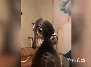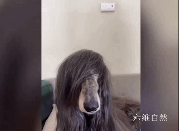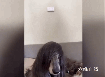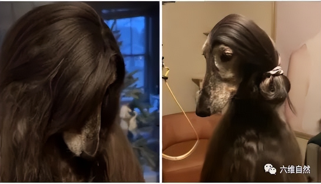 据介绍,这只宠物犬还是一种猎犬——阿富汗猎犬,本身自带长长的毛发,不管是蓬松的发型,还是将毛发扎起来,都非常柔顺光泽,特别是将毛发挡着犬的脸部,更像是女士的发型,远远看起来像人类一样。