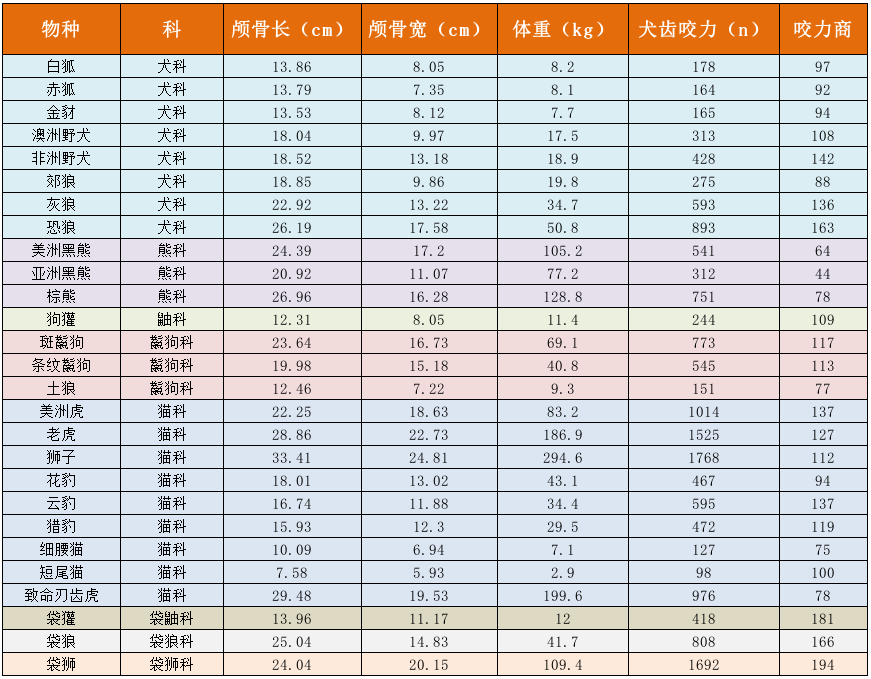 在食肉动物里面,打架、捕猎所需要用的是犬齿咬力,而进食的时候多用裂齿咬力,这是两个完全不同的概念,不能混为一谈,也不能交叉比较。