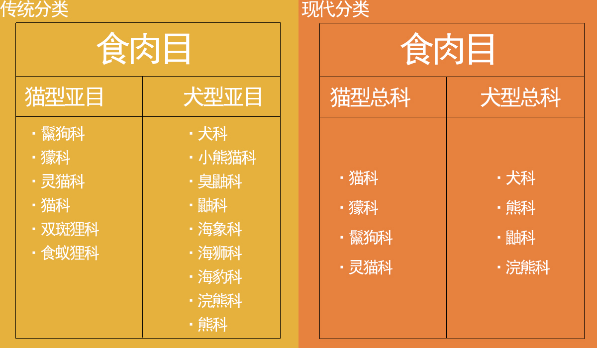 关于以上的分类等级我们不需要太过熟悉,只需要有一个大致的印象即可,在传统分类学上,鬣狗科与猫科、獴科等同属于猫型亚目,而犬科、熊科、鼬科等则分在犬型亚目下面。