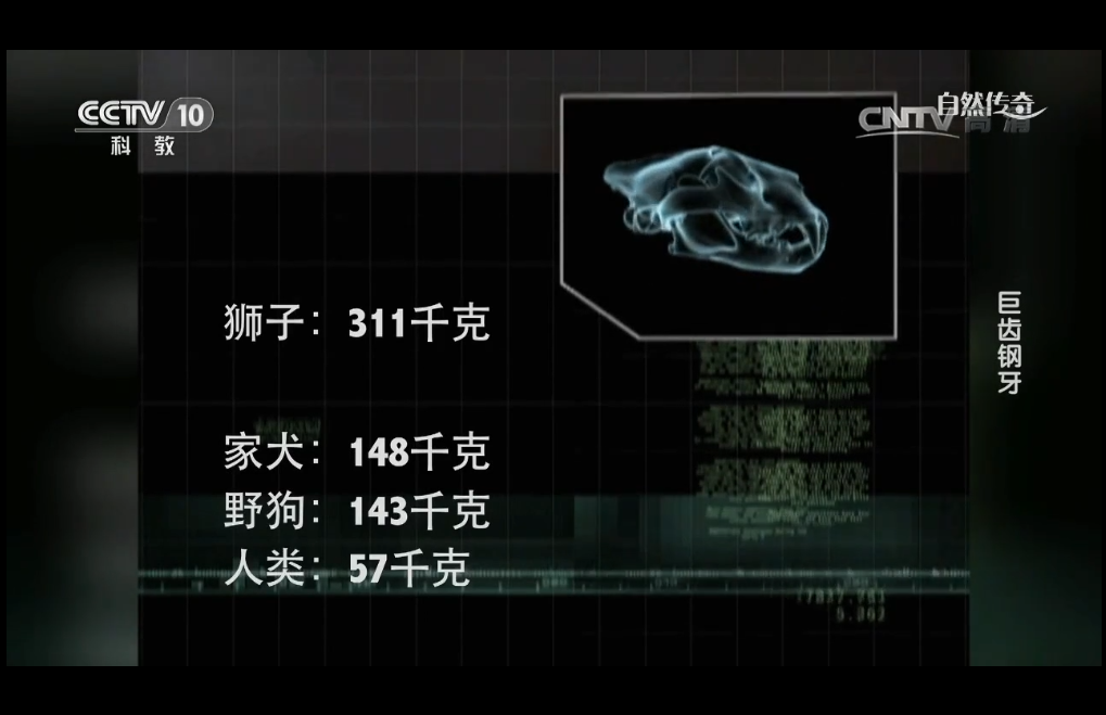 2005年,悉尼大学生物科学院的一些专家们曾在《生命科学》上发表了一篇研究论文,里面给出了大多数野生动物的犬齿咬力数据,从这些数据里面我们可以直观地看到一只体重69.1千克的斑鬣狗,其犬齿咬力为733牛顿,咬力商为117;而一只体重为294.6千克的狮子,犬齿咬力为1768牛顿,咬力商为112。