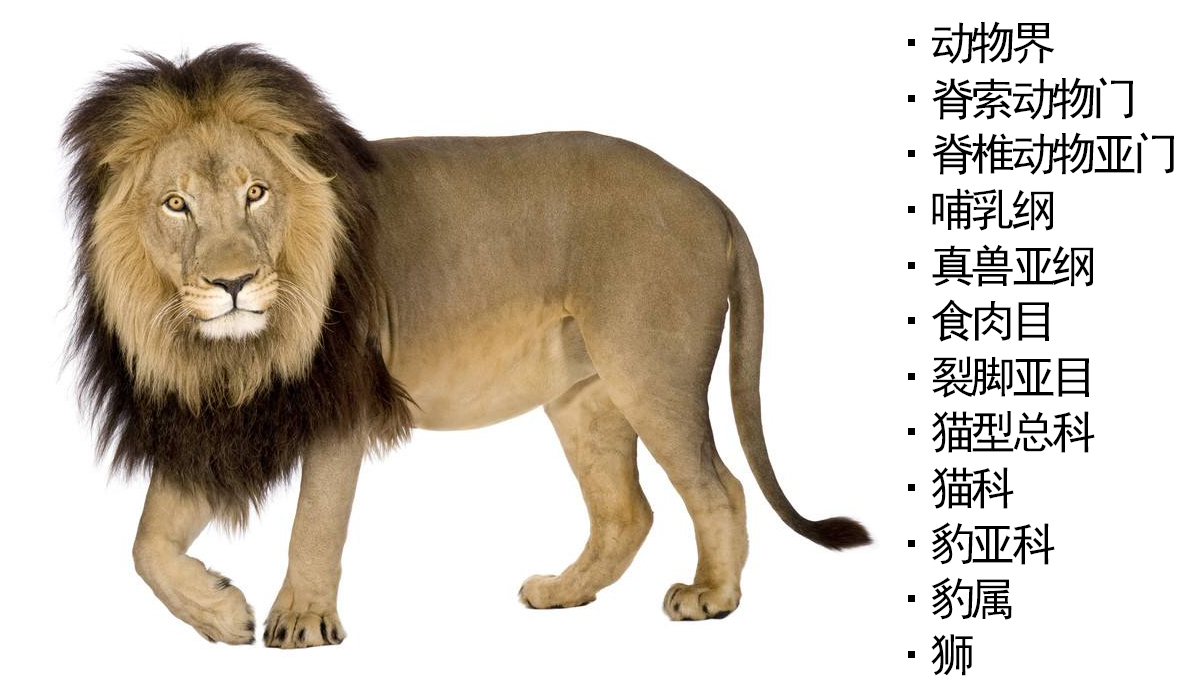 简单来说就是根据生物之间相同、相异的程度,亲缘关系的远近,使用不同的等级特征,可以将动物分成界、门、纲、目等几个重要的分类阶元,比如拿狮子来说,它就属于动物界、脊索动物门、哺乳纲、食肉目、猫科、豹属、狮种。
