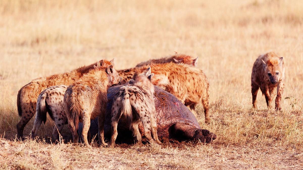 由于斑鬣狗食量较大,且群居,所以生活在拥有大量“清道夫”的非洲草原上,它们想要靠吃腐肉维持生活,是绝无可能的,斑鬣狗们必须不停地捕猎,而且需要捕食大型猎物。