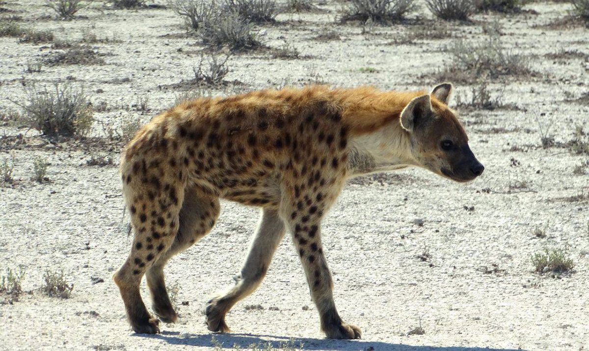 由于斑鬣狗最常用的一种捕猎手段是“掏肛”,所以它们深知此招的厉害,为了防止非洲野犬等动物将此招用在自己的身上,于是斑鬣狗干脆进化出了前肢长后肢短,前肢发达后肢较弱,臀部小而圆的形态特征,这样的好处就是使别的动物不容易抓住它的臀部,有效地规避了被“掏”的风险。