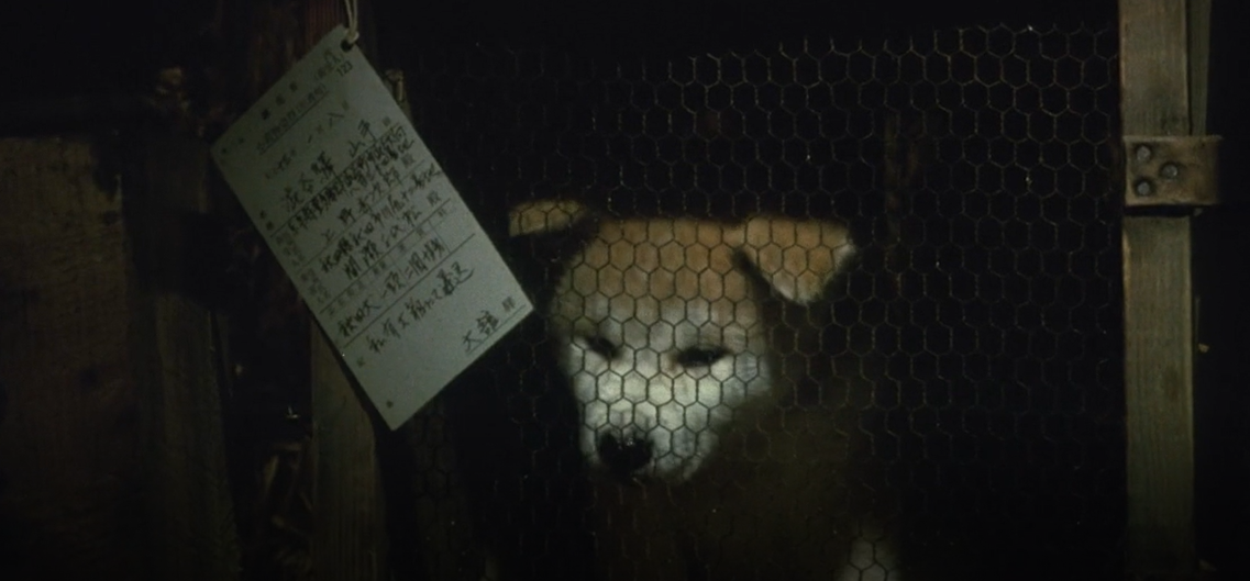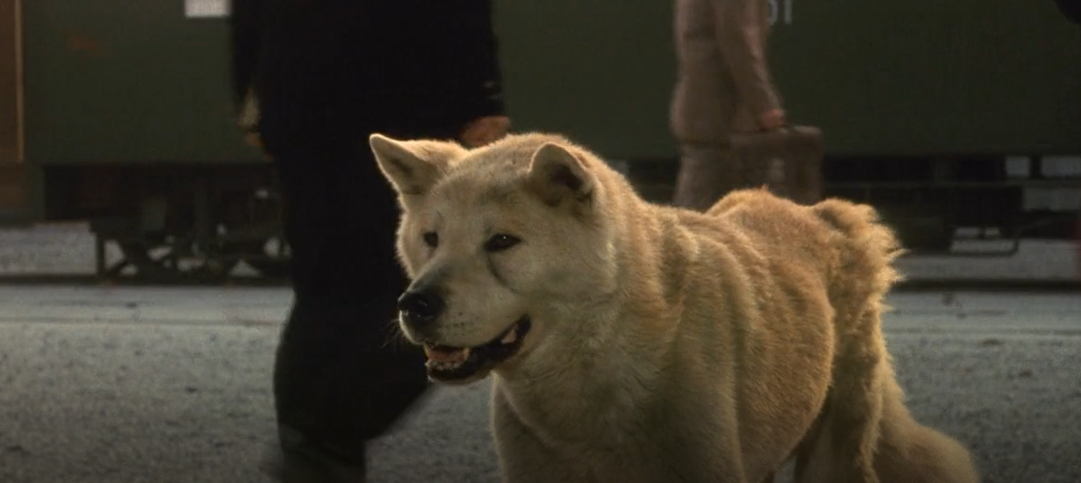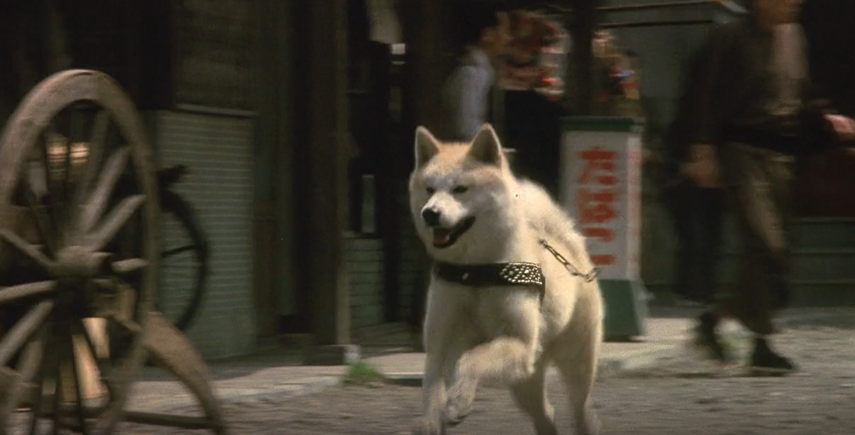 为了不打扰葬礼,小八被锁链锁了起来。车队载着教授遗体走了,小八用尽全力挣脱锁链,跟了车队一路,直到路过车站,小八筋疲力尽地停下。