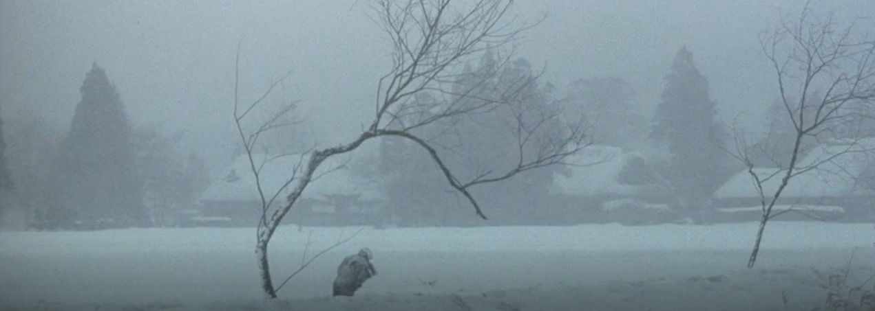 下部分蓝灰色的大雪纷飞,代表了现实,在一个寒冷的冬日夜晚,小八孤身等待。
