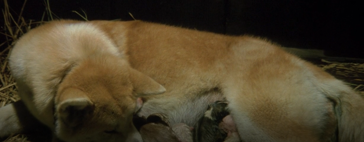 接到小狗,帮佣和菊三郎都以为这只小狗死了,但教授叫人拿来牛奶,倒在小盘子放在小狗面前,本能的求生欲让小狗慢慢苏醒过来,努力地舔食牛奶。