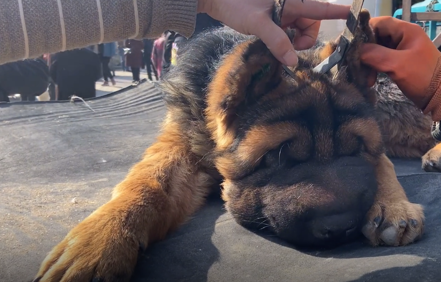 不过,大哥没开心多久,这位路人就发现了这只德牧的不足之处,只见他用手摆弄了一下狗狗耳朵上的立耳器,然后将狗狗的耳朵竖起来之后,说道:“耳朵这样粘起来,中间拉一下子!”大哥则立马说道:“他都有架子,(不过,架子)掉了!”“这拉上了!”听到大哥的话,路人还是继续将狗狗的耳朵拉上后,说道:“这可漂亮,我搁这都管好啊!”
