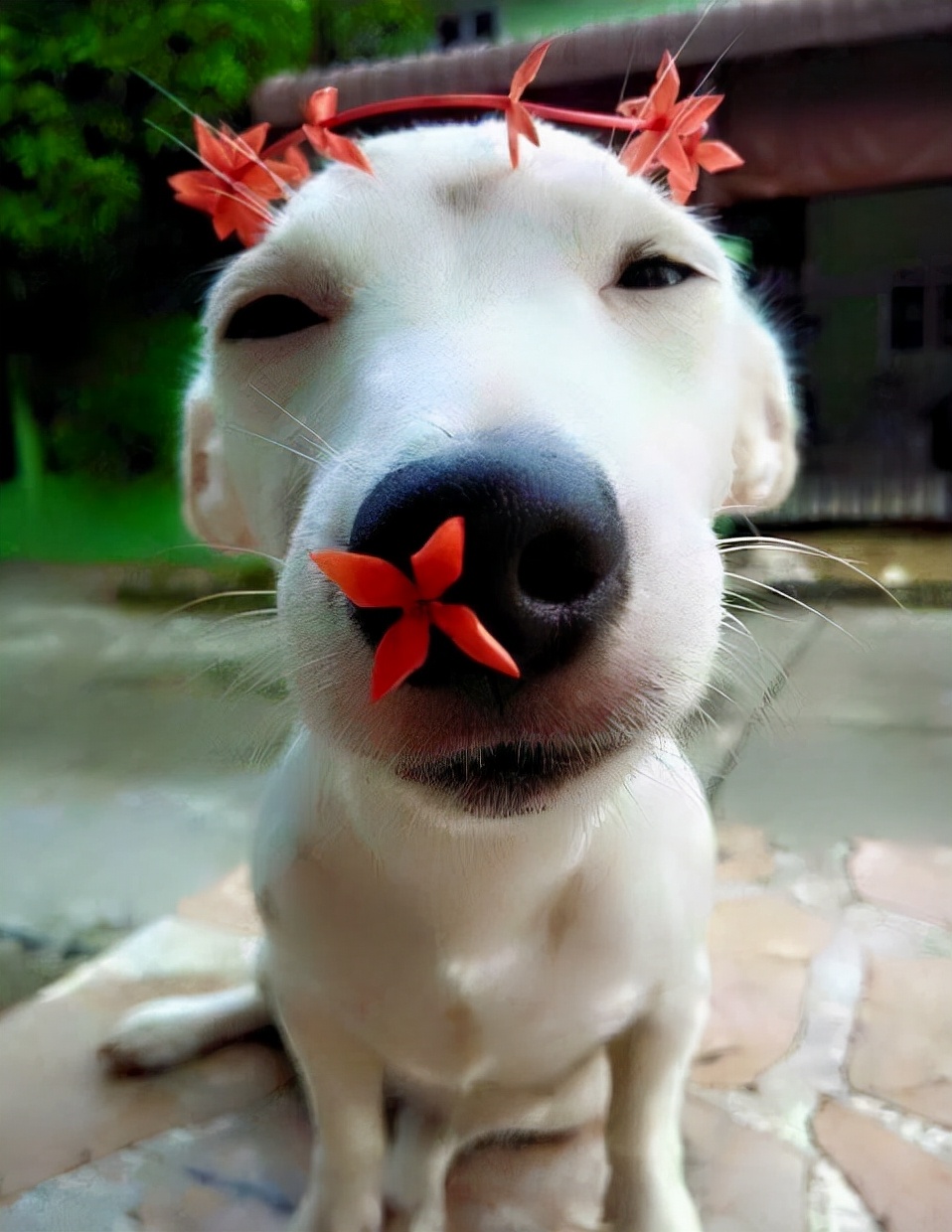 7、噗呲,这张图就很有趣了,用四叶红花拼成花环给狗狗带上,狗狗都显得秀气许多(除了鼻孔插花……)